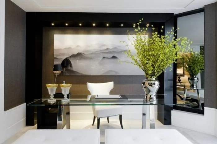 1-feng-shui-buero-pflanze-vase-schreibtisch-glas-bild-weisser-stuhl-schwarze-wand-hocker