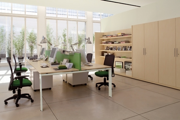 Büroeinrichtung ausstatung in grüner farbe mit egronomischen stühlen