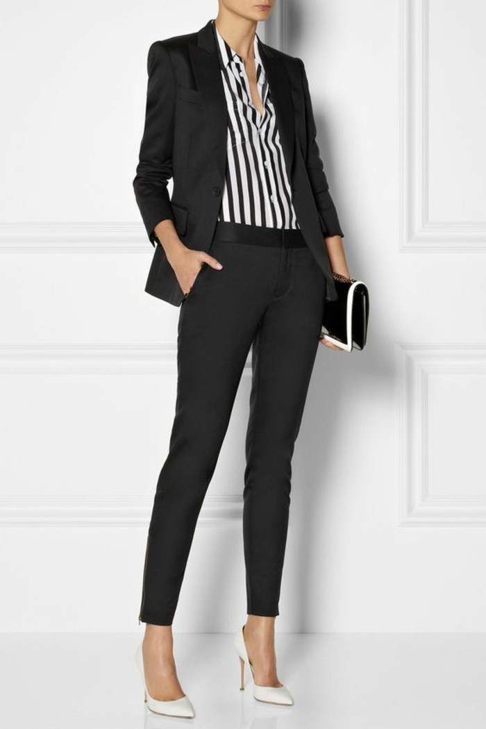 1 bussines kleidung schwarzer hosenanzug damen business kleine schwarze tasche gestreiftes elegantes hemd hohe weise schuhe