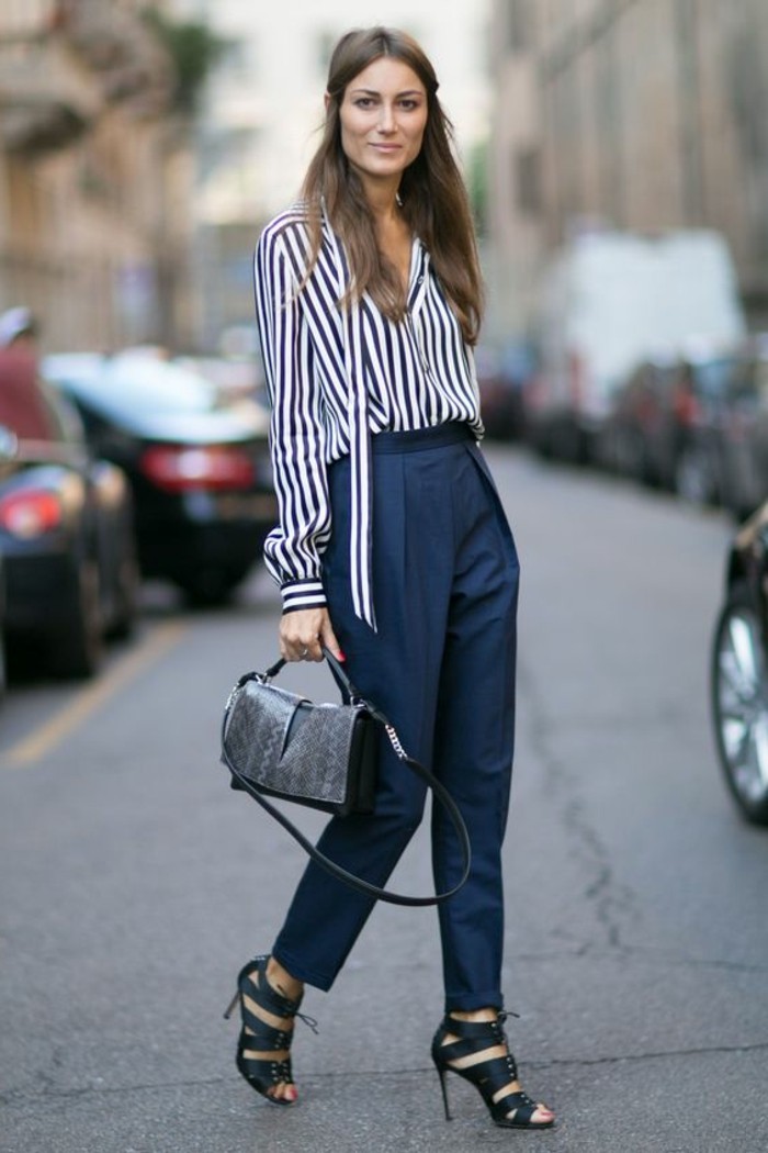 Business kleider elegantes gestreiftes hemd blaue hose schwarze tasche hohe schwarze schuhe