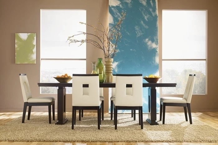 - Er sollte so groß sein, dass die Stühle auch im zurückgerückten Zustand noch vollständig auf dem Teppich stehen.
