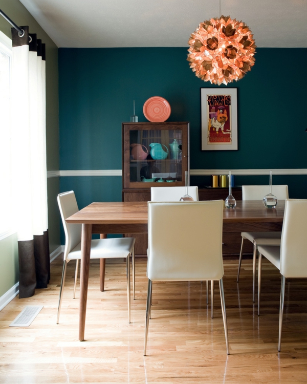 Moderne stühle für esszimmer mit einem coolen lüster über dem tisch