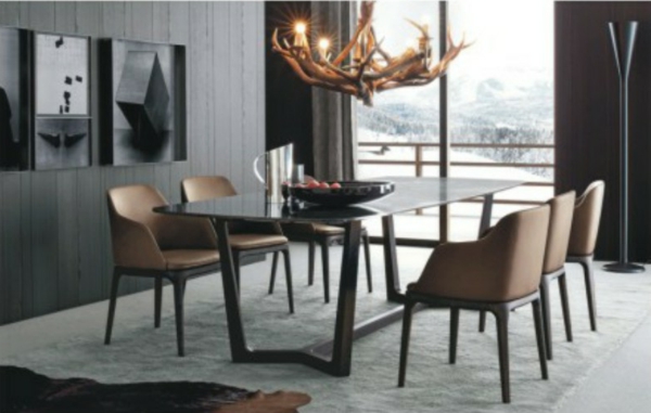 Moderne stühle für esszimmer mit einem eleganten kronleuchter