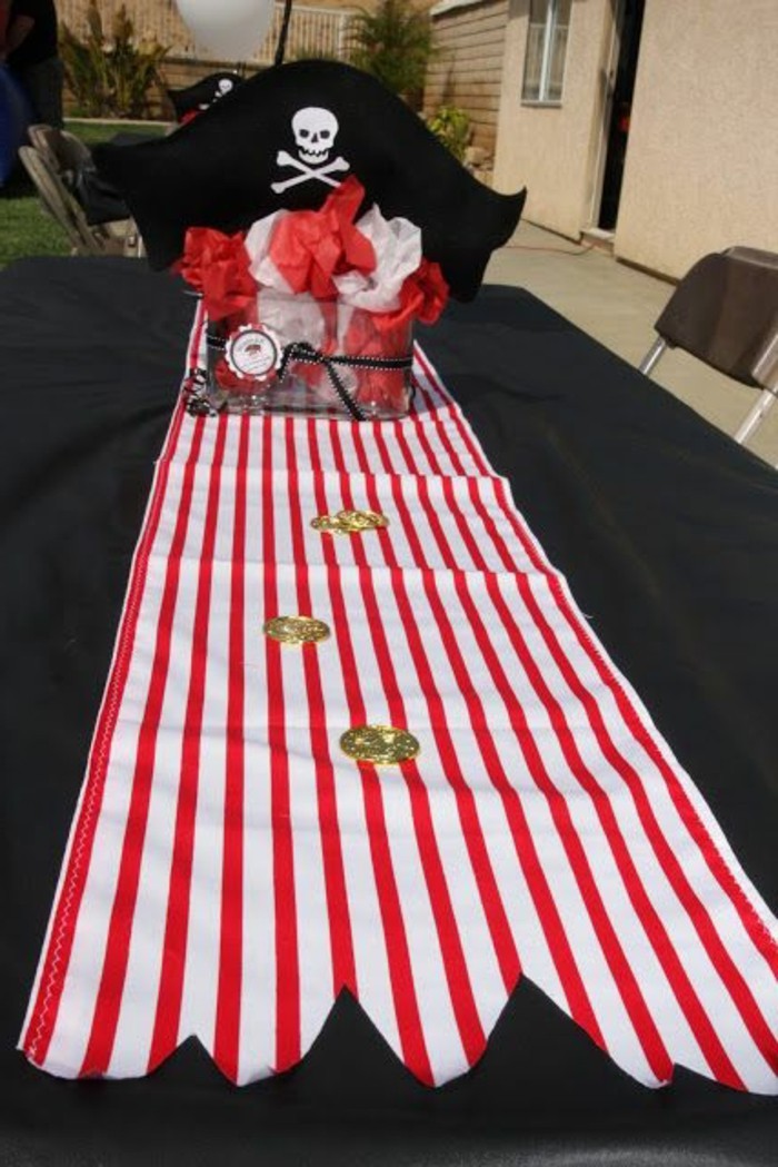 Tischdekoration mit Piraten Motiven Tischläufer an weiß roten Streifen