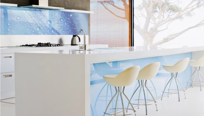 designer küchen bilder, kücheninsel in weiß und hellblau, moderne kpchenwand mit wassertropfen