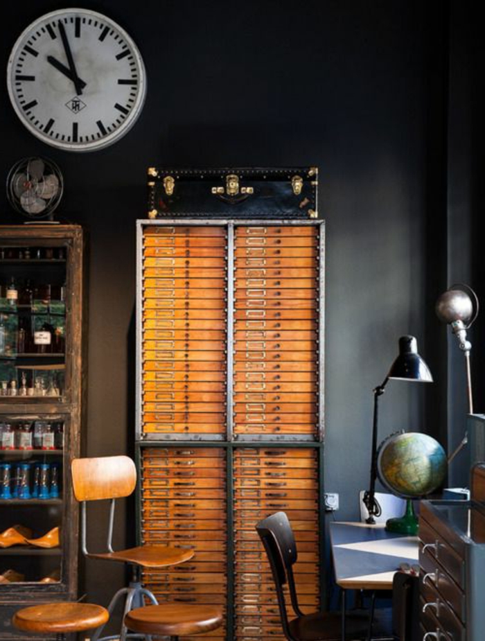Arbeitszimmer Schrank Koffer Schreibtisch Leselampe Globus Schubladen Regale Ventilator alte Wanduhr