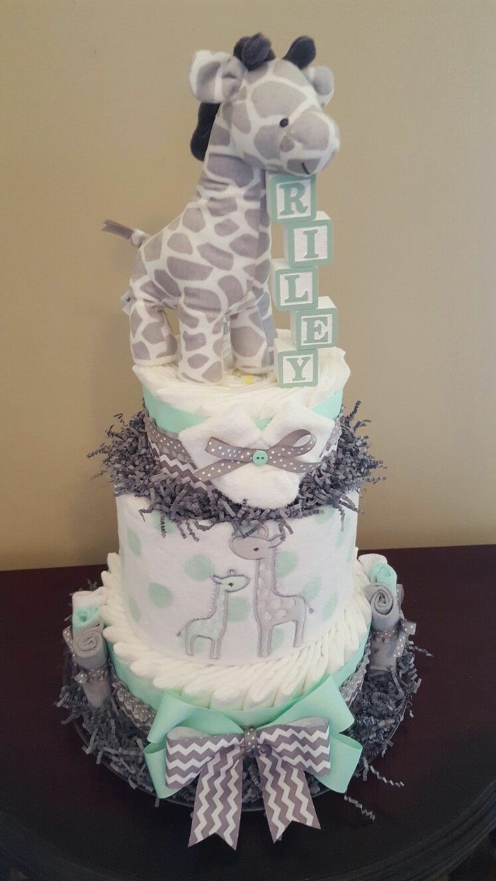 Windeltorte mit giraffe kuscheltier deko für babyparty der name des babys und schöne dekorationen