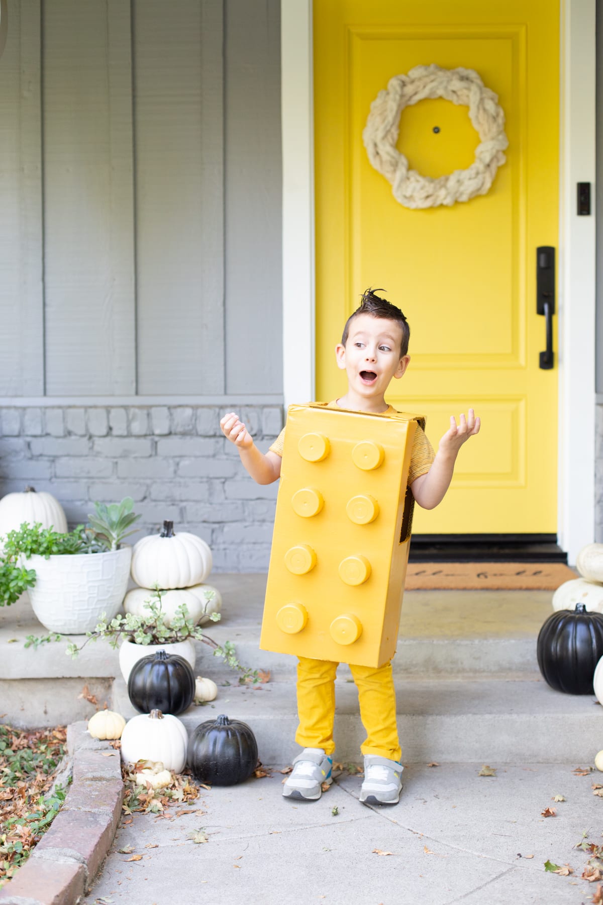 Kinder faschingskostüme lego kostüm fasching in gelb jungen in gelben hosen turnschuhe tür in gelb mit kranz