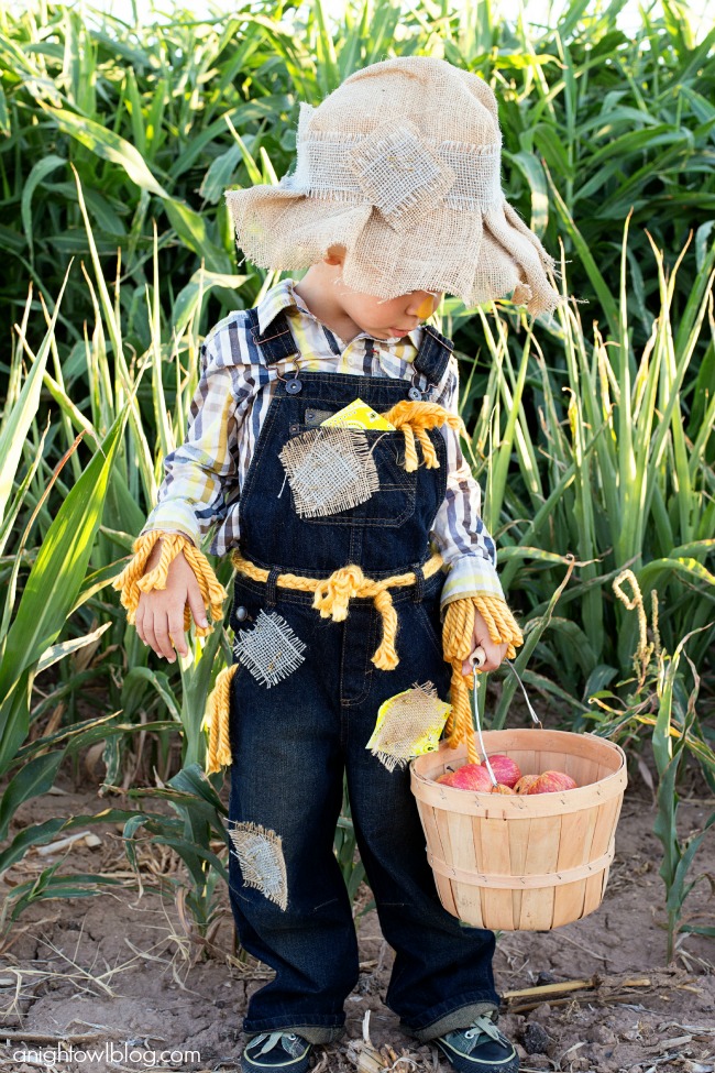 Kinderkostüme fasching vogelschuehe kostüm latzhose aus denim mit flicken korb mit äpfeln