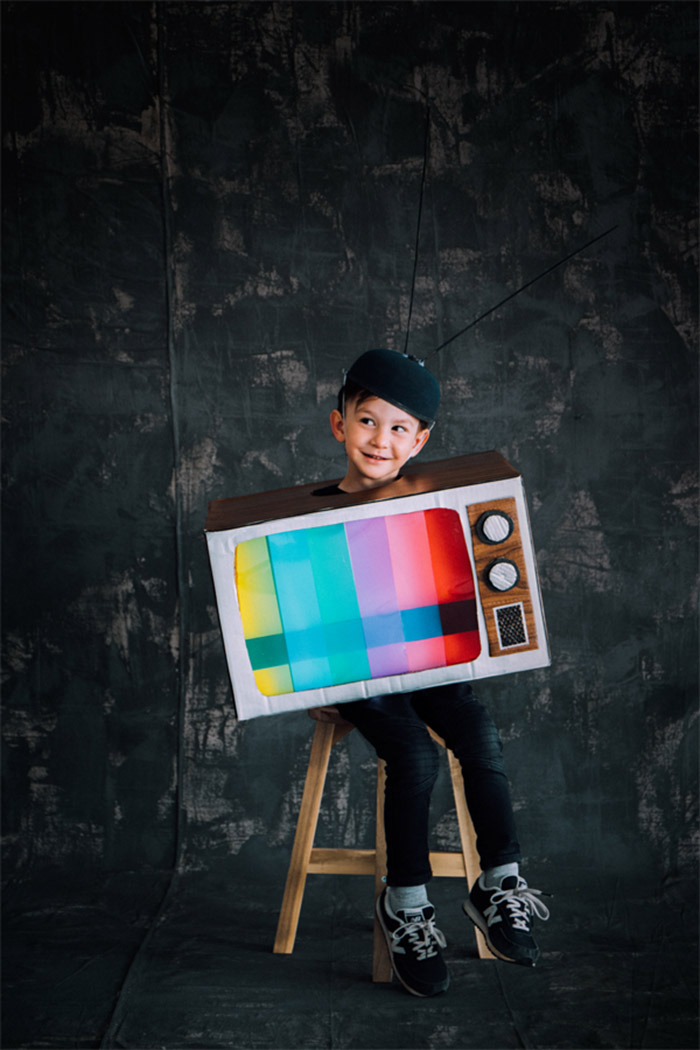 Retro fernseher kostüm kinder faschingskostüme bunte streifen am bildschirm junge in schwarz angezogen mit hut mit antennen