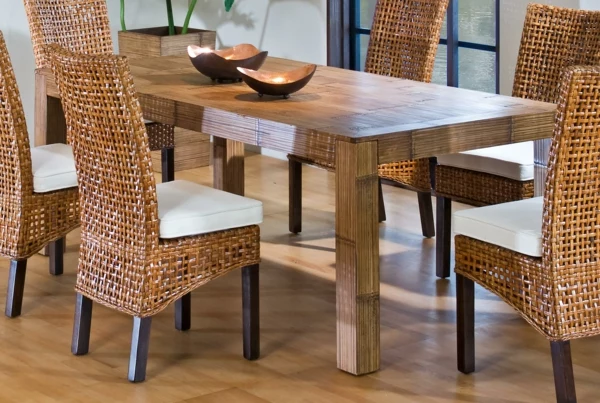 Sogenanntes Polyrattan, meist aus Polyethylen (PE), ist vor allem für den Außenbereich konzipiert. Die Vorteile liegen auf der Hand: Es ist wetterfest, UV-beständig und extrem pflegeleicht. Marken wie Dedon zeigen, dass auch synthetische Fasern hochwertig und schick sein können. Für das Esszimmer im Innenbereich ist es eine Frage des persönlichen Geschmacks. Es fehlt die einzigartige Patina und der Geruch von Naturmaterial, dafür ist es unempfindlicher gegenüber verschütteten Getränken – eine Überlegung wert für Familien!