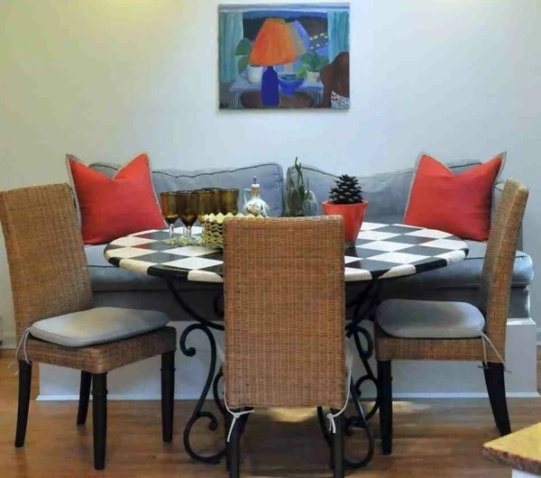 - Material wiederholen: Wählen Sie Stühle, deren Beine aus dem gleichen Material oder in der gleichen Farbe wie die Bankbeine oder der Esstisch sind.