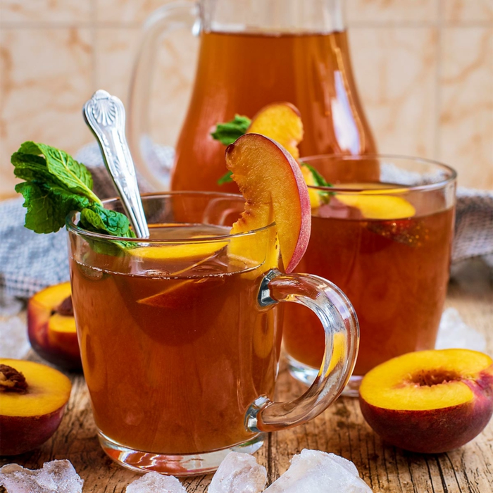 Statt Pfirsichschnitzen kochen wir einen Pfirsichsirup. Das gibt intensiven Geschmack und der Tee bleibt klar. Das Prinzip funktioniert mit fast allen Früchten (Erdbeeren, Himbeeren, Mango…).