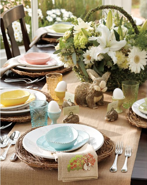 Easter table setting idea layout lunch party picnic decoration centerpiece serving decor spring tulip centerpiece cottage chic style blue flower orange green bright colorful elegant