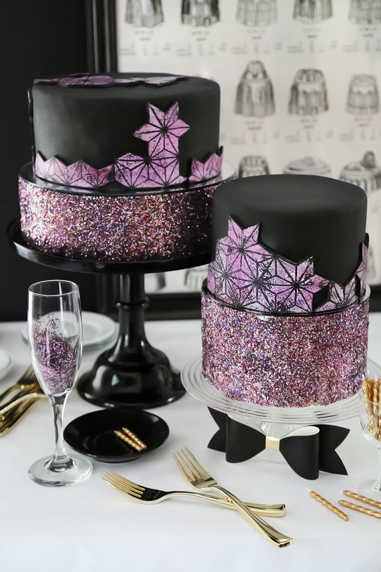 Torten verzieren mit schwarzem fondant und rosa glitzer goldene gabel party geburtstagstorte