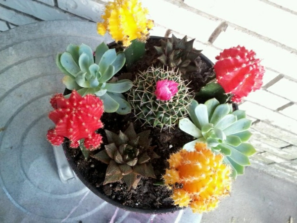 Sie wollen eine Gruppe von Kakteen als kleines Wüsten-Arrangement pflanzen? Eine tolle Idee! Achten Sie darauf, Arten mit ähnlichen Bedürfnissen zu kombinieren. Ein Wüstenkaktus wie der Goldkugelkaktus (Echinocactus grusonii) braucht viel mehr Sonne und weniger Wasser als ein Blattkaktus (Epiphyllum), der eher aus feuchteren Wäldern stammt.