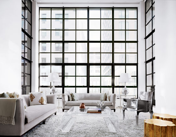 Räumliches Zimmer hohe Zimmerdecke stilvolle Möbel eleganter Teppich weiß