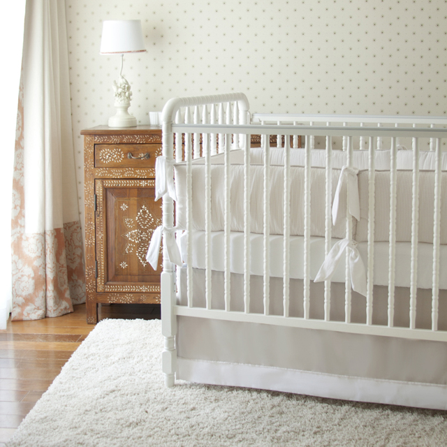Babyzimmer weiße Möbel flaumiger Teppich weiß vintage Kommode