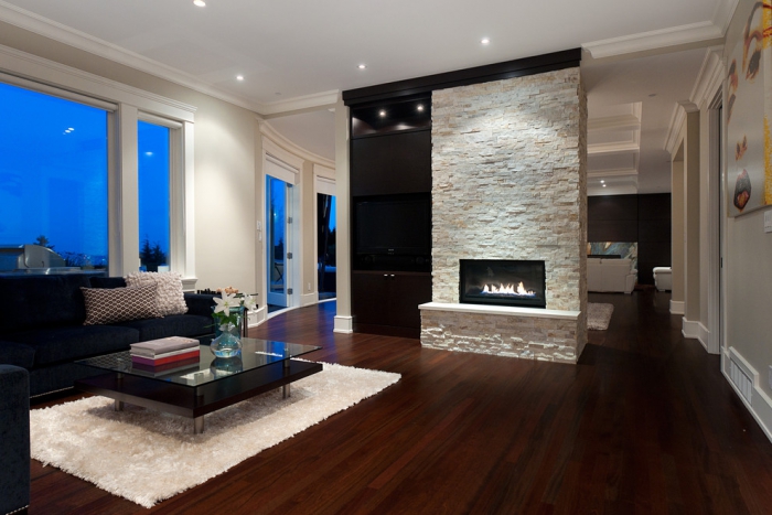 Elegantes Wohnzimmer Interieur Kamin großes Sofa weißer Teppich