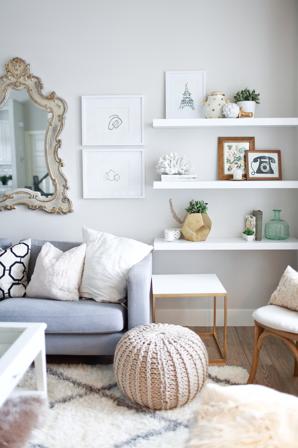 Gemütliches Wohnzimmer Interieur skandinavischer Stil flaumiger Teppich