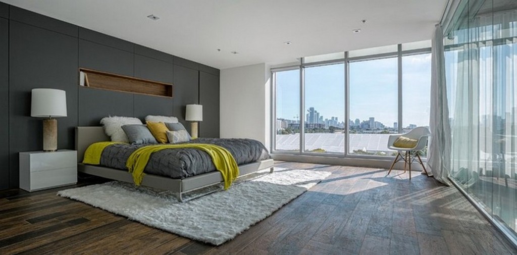 Modernes graues Schlafzimmer kleiner Teppich weiß