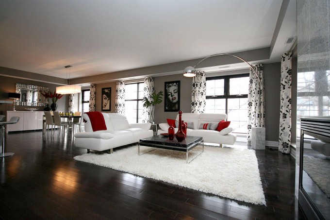 Räumliche Wohnung schwarz weißes Interieur rote Akzente retro Wandbilder weißer Teppich