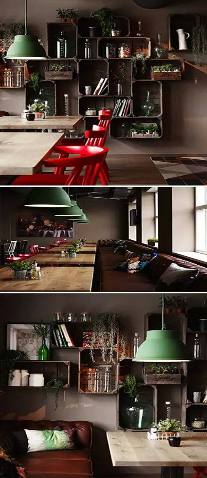 Drei fotos mit esszimmer welche farben passen zusammen rote akzente von den esszimmer stühlen braune regale