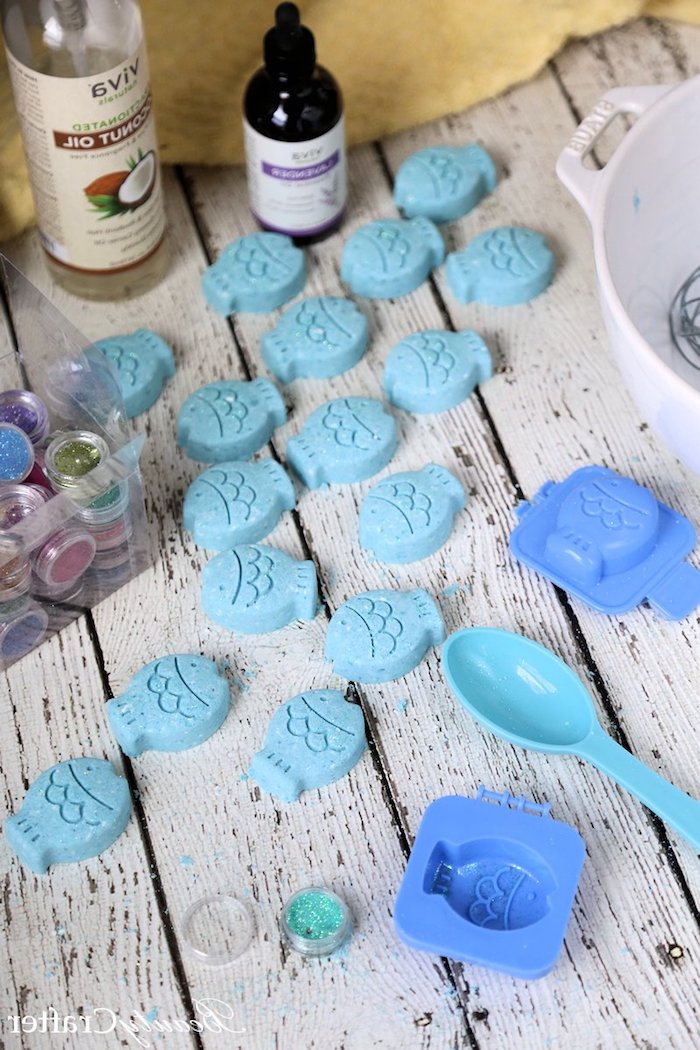 Badekugeln herstellen selber machen blaue badekugel fische läffel form ätherisches öl