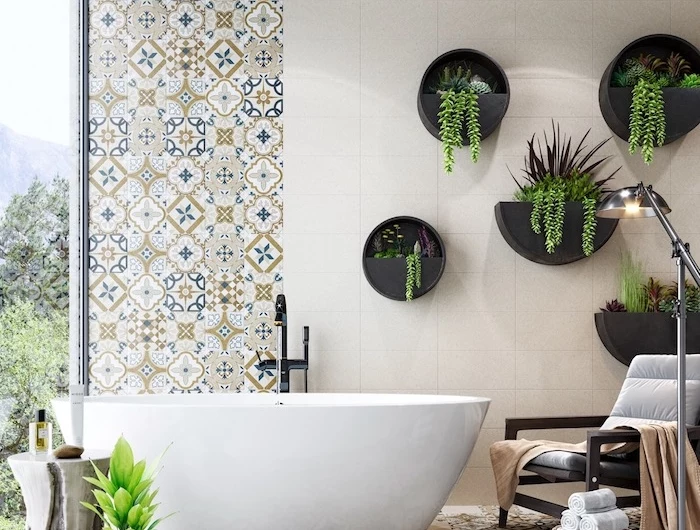 Biophilic Design im Bad: Dieser Trend holt die Natur ins Haus und fördert unser Wohlbefinden. Im Bad lässt sich das leicht umsetzen. Denken Sie an Pflanzen, die hohe Luftfeuchtigkeit lieben, wie Farne, Efeututen oder die Glücksfeder. Kombinieren Sie diese mit Materialien wie Holzoptik-Fliesen, Waschtischen aus Massivholz oder Accessoires aus Bambus. So wird Ihr Bad zur grünen Oase.