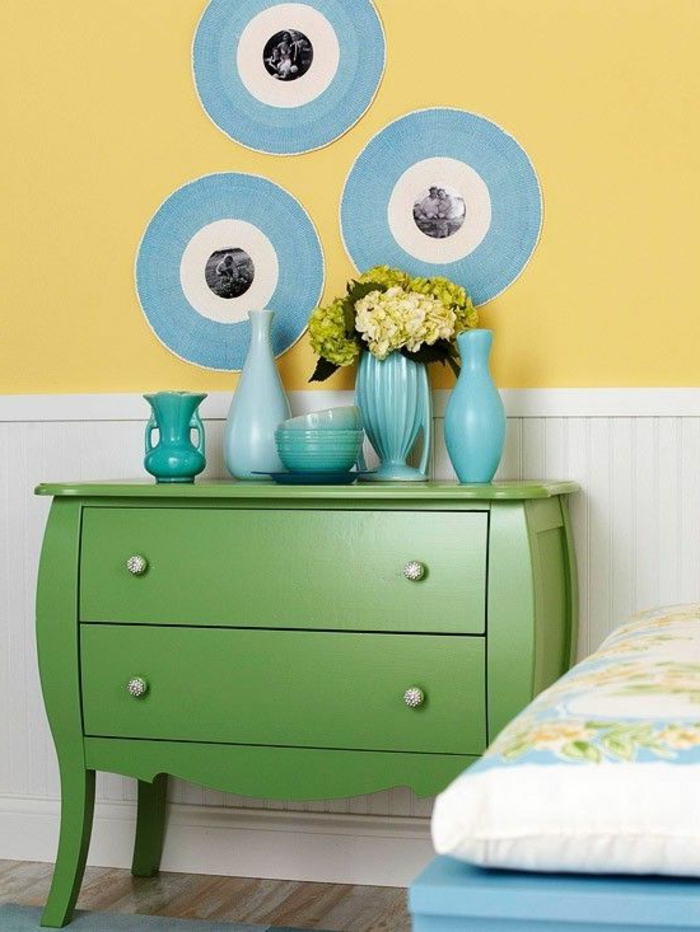 Schlafzimmer frische Gestaltung aqua Nuancen grüne Kommode gelbe Wand blaue Schallplatten kreative Wandgestaltung
