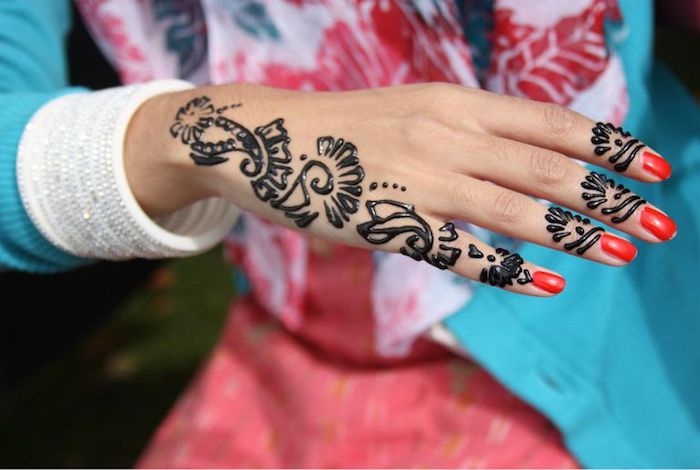 7 tattoo selber machen roter nagellack kleine temporäre tätowierung mit schwarzem henna am hand mehndi motive
