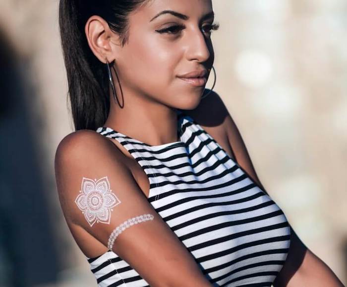 9 weißes henna frau mi kleiner temporären tätowierung an der schulter große ohrringe dunkelbraune haare