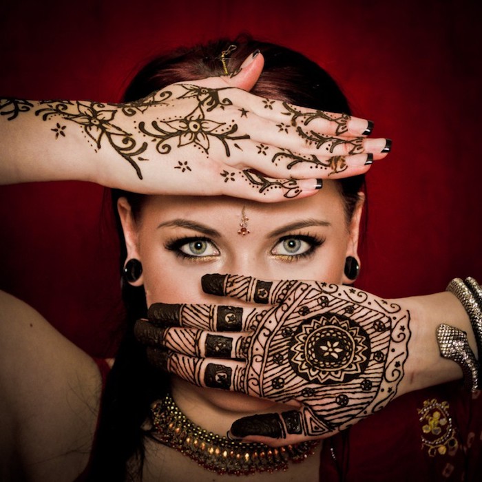 Henna bilder frau mit roten haaren und grauen augen großes schmuck tätowierungen mit henna an den armen
