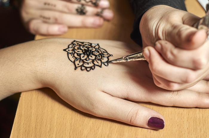 Henna stift lila nagellack kurze nagel temporäre tätowierung mit blumen motiv henna muster arm verzieren
