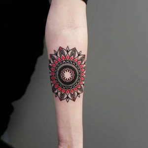 - Simpel füllen: Fülle den innersten Ring mit kleinen Kreisen. Den mittleren mit vier Blütenblättern. Den äußeren mit vier großen Bögen, die von einer Linie zur nächsten gehen.