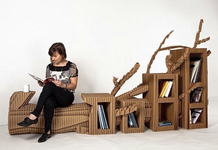 Möbel pappe pappwand eine frau sitzt und liest ein buch kartonbank sitzplatz und regal