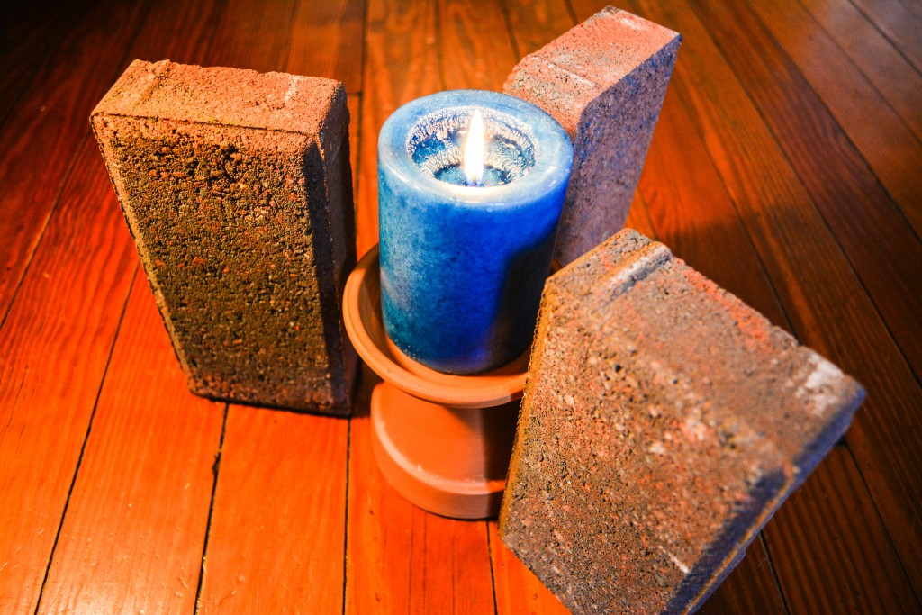 Ein brauner boden aus holz und eine blaue große kerze und ein kleiner brauner blumentopf aus keramik teelichtofen bauanleitung