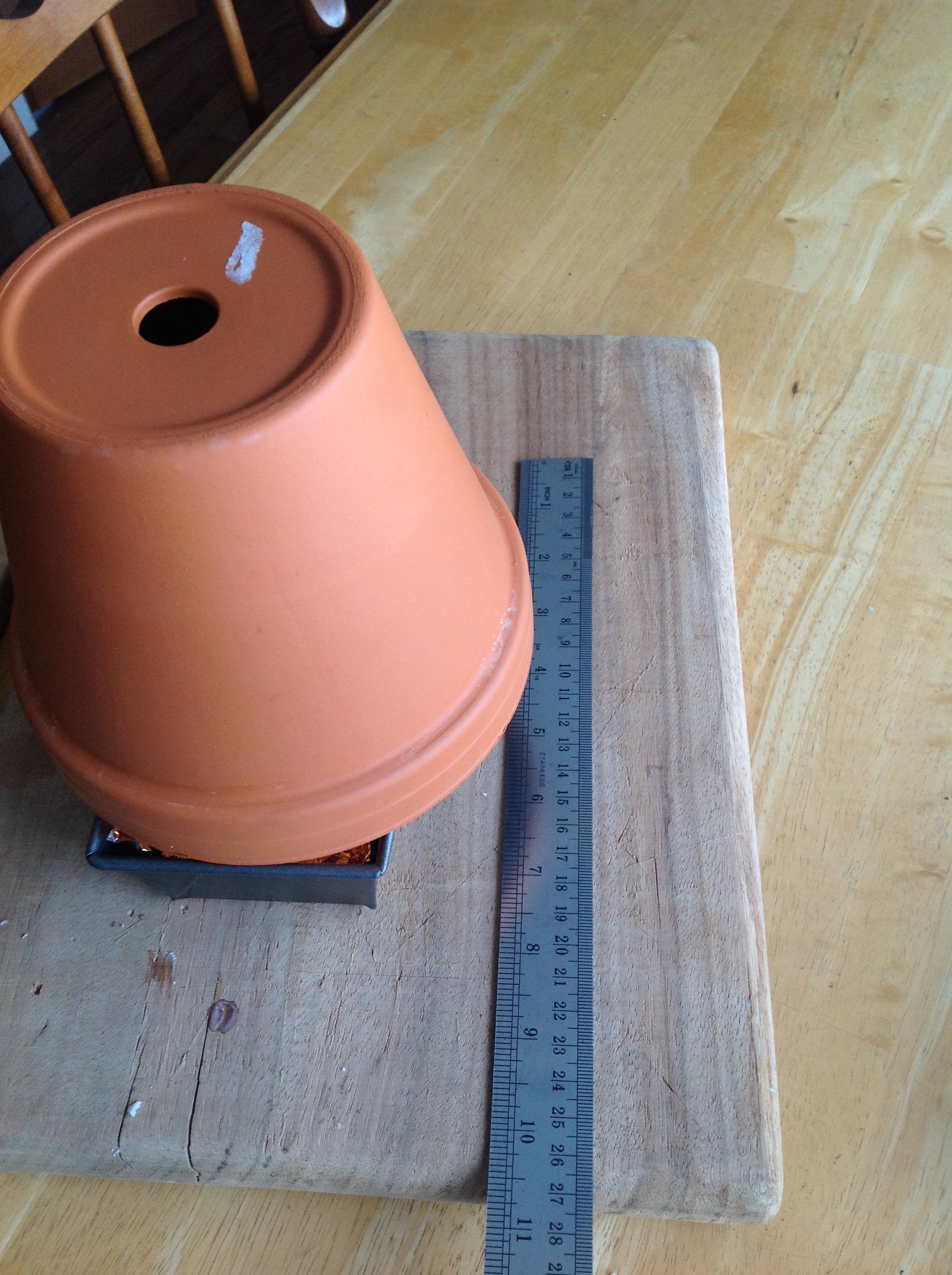 Ein holzbrett und ein graues lineal und blumentopf aus keramik ein stuhl und ein tisch aus holz teelichtofen materialliste