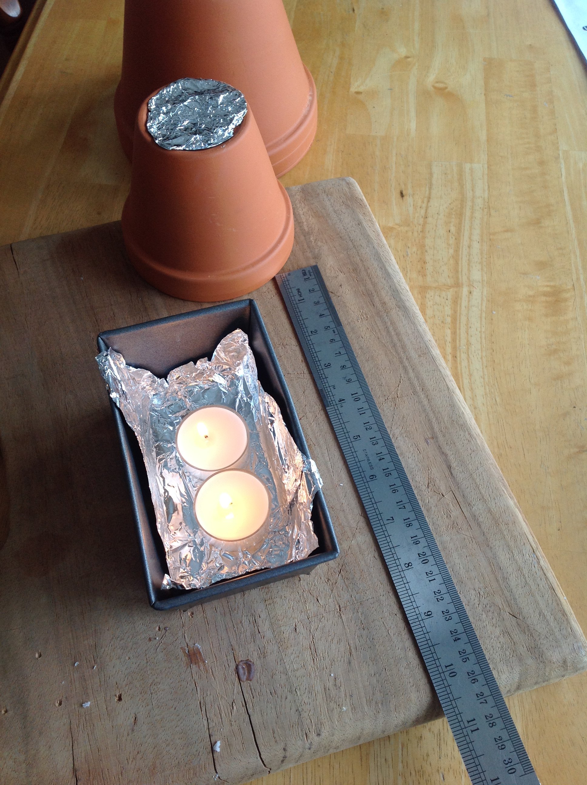 Ein langes graues lineal und ein holzbrett zwei weiße teelichter und zwei braune blumentöpfe aus keramik teelichtofen materialliste