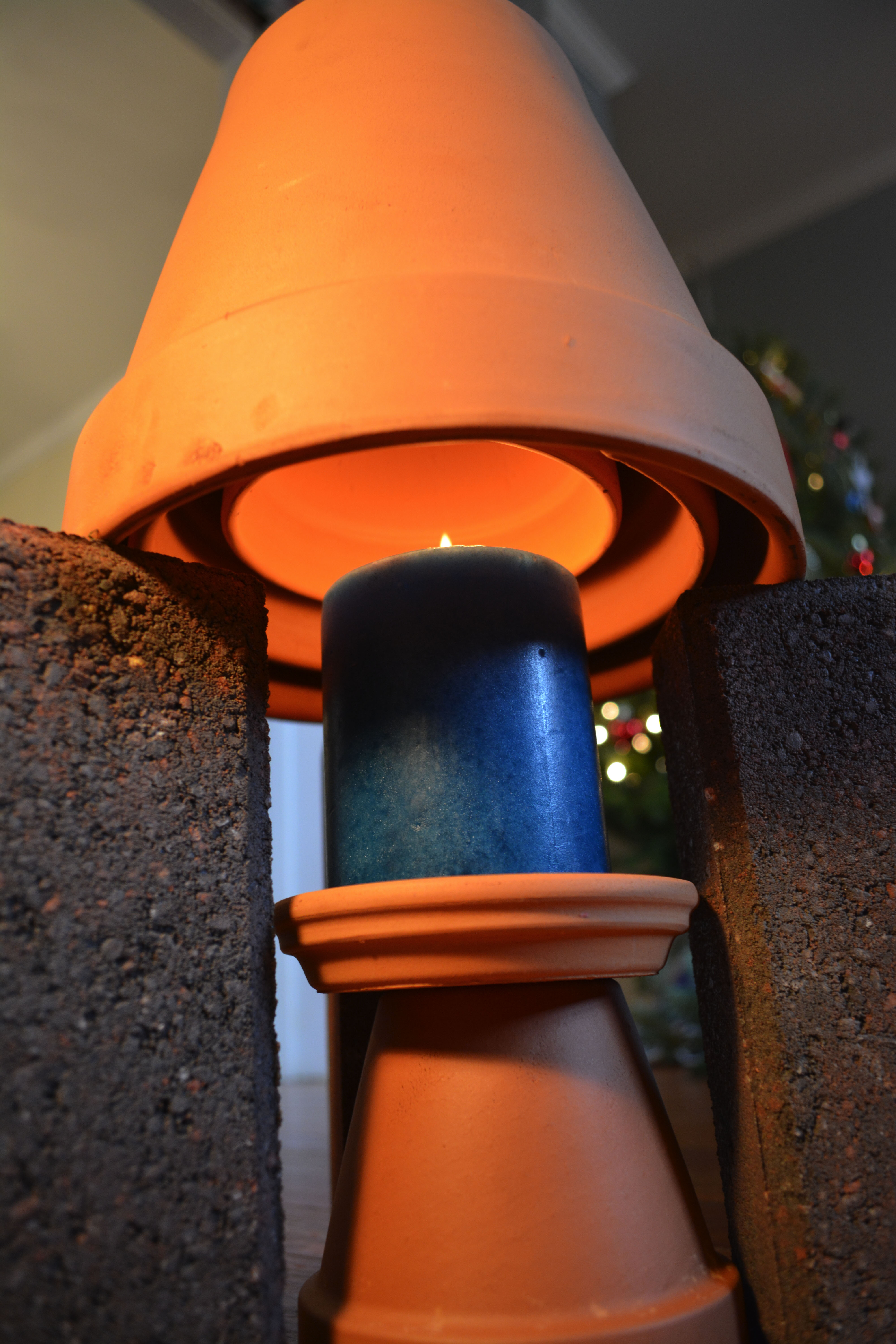 Ein zimmer mit weißen und grünen wämdem eine große blaue kerze große und kleine braune blumentöpfe aus keramit teelichtofen selber bauen
