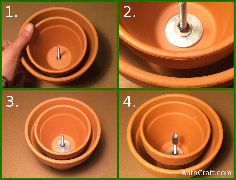 Eine bauanleitung in vier schritten eine hand mit einem tattoo und zwei kleine braune blumentöpfe aus keramik