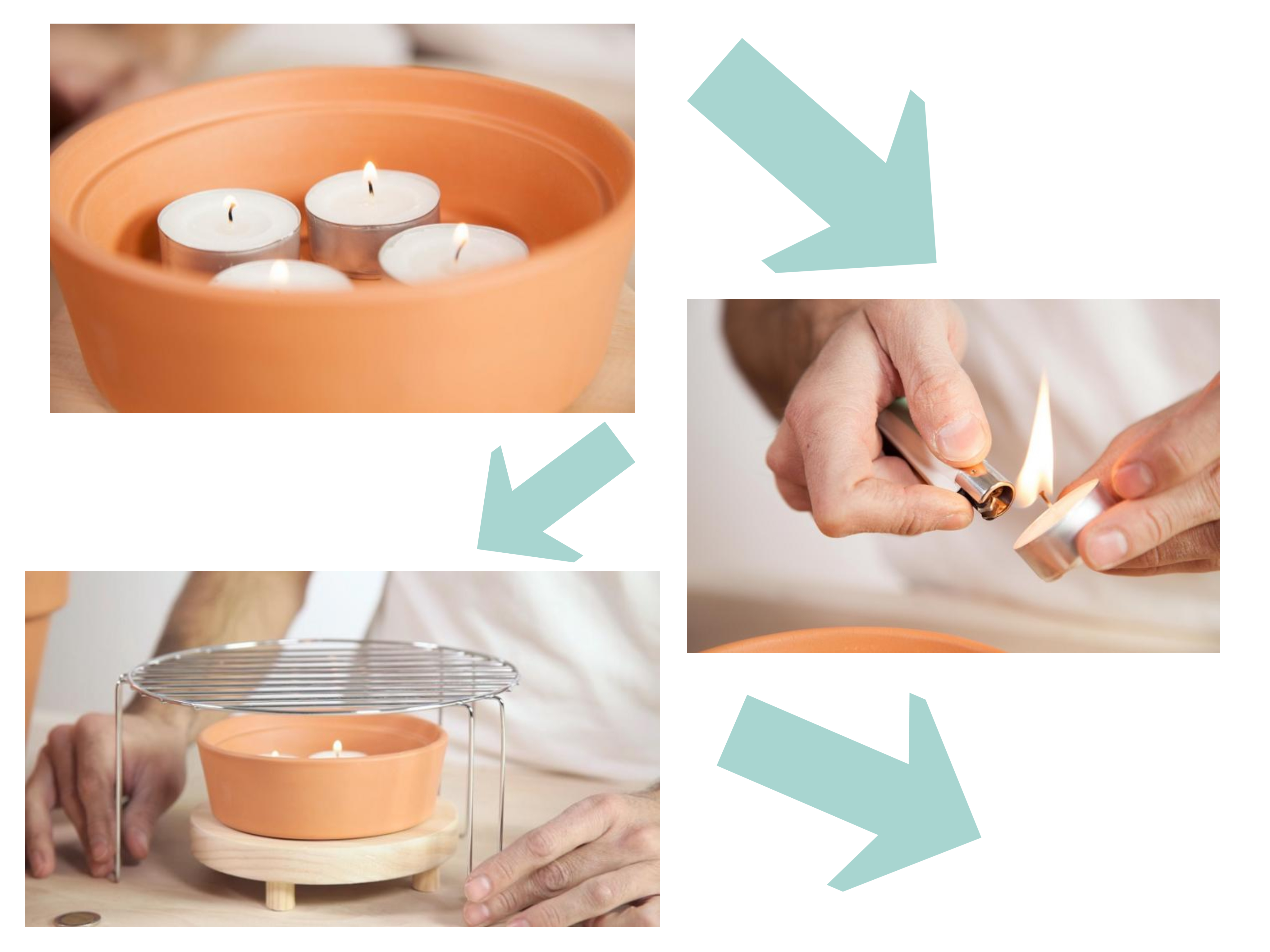 Eine diy schritt für schritt bauanleitung einen teelichtofen selber bauen ein mann und hände vier kleine weiße kerzen und braune blumentöpfe