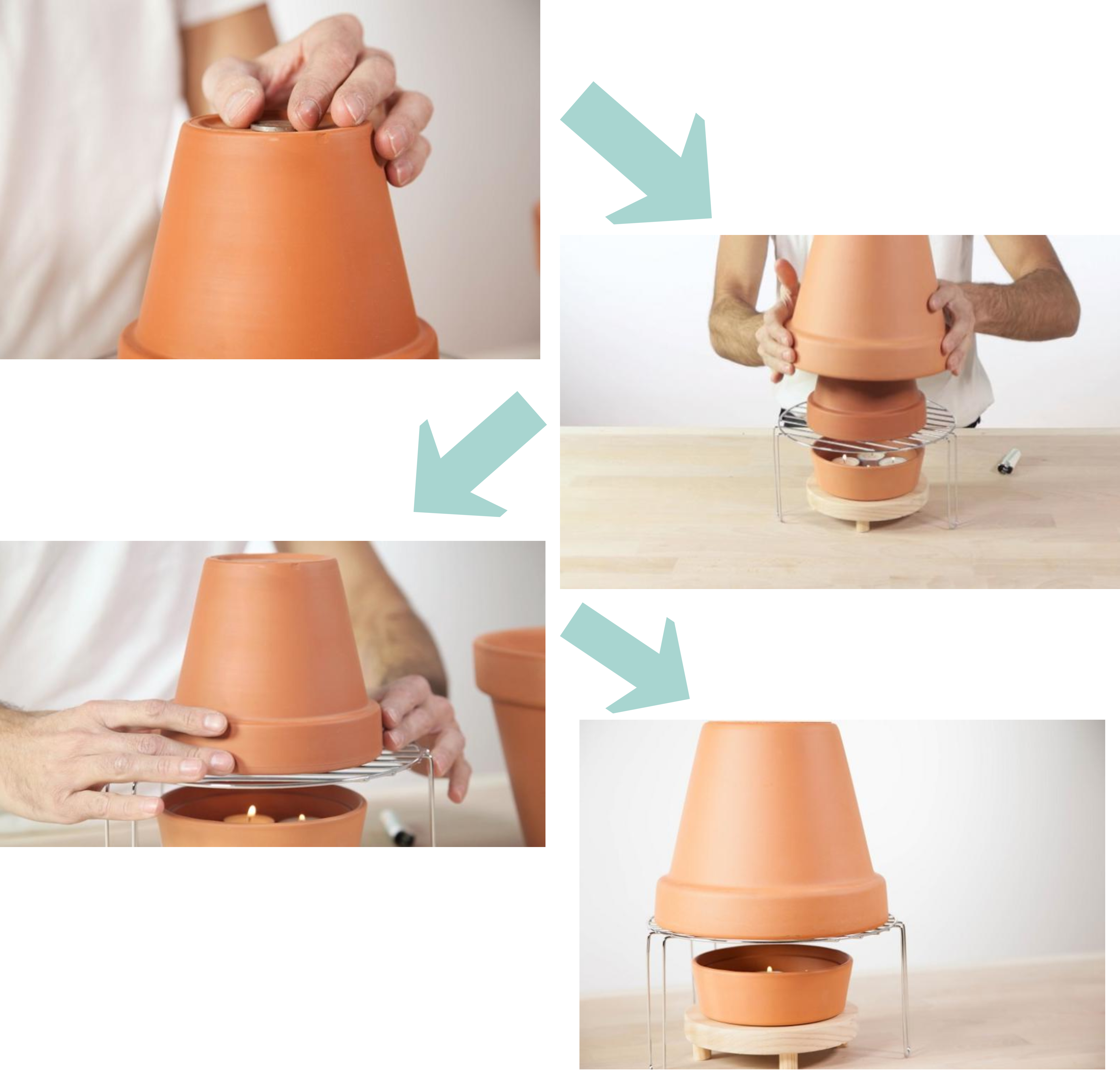 Eine schritt für schritt bauanleitung einen teelichtofen selber bauen ein mann mit einem weißen hemd ein tisch aus holz und blumentöpfe aus keramik