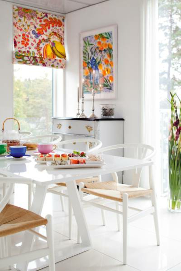 Interior color schemes home minimalist white dining room interior decor ideas with small dining set and colorful window coverng overlooking with attractive wall picture resized