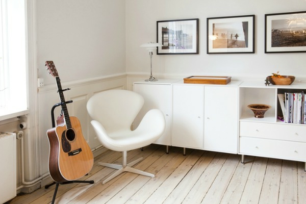 Skandinavisches appartement einrichten eine guitarre neben dem weißen stuhl