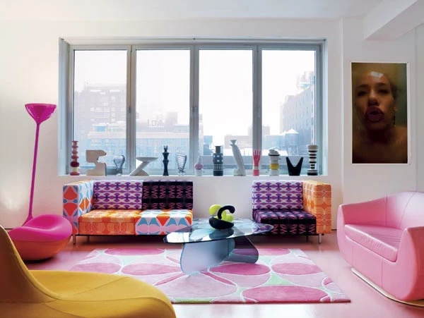 Diese Wohnraumgestaltung erstaunt durch den bunten extravaganten Teppich: