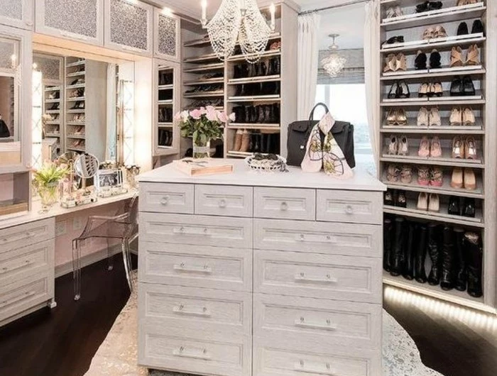 ankleidezimmer-einrichten-begehbarer-kleiderschrank-weiser-kronleuchter-schuhe-kleider