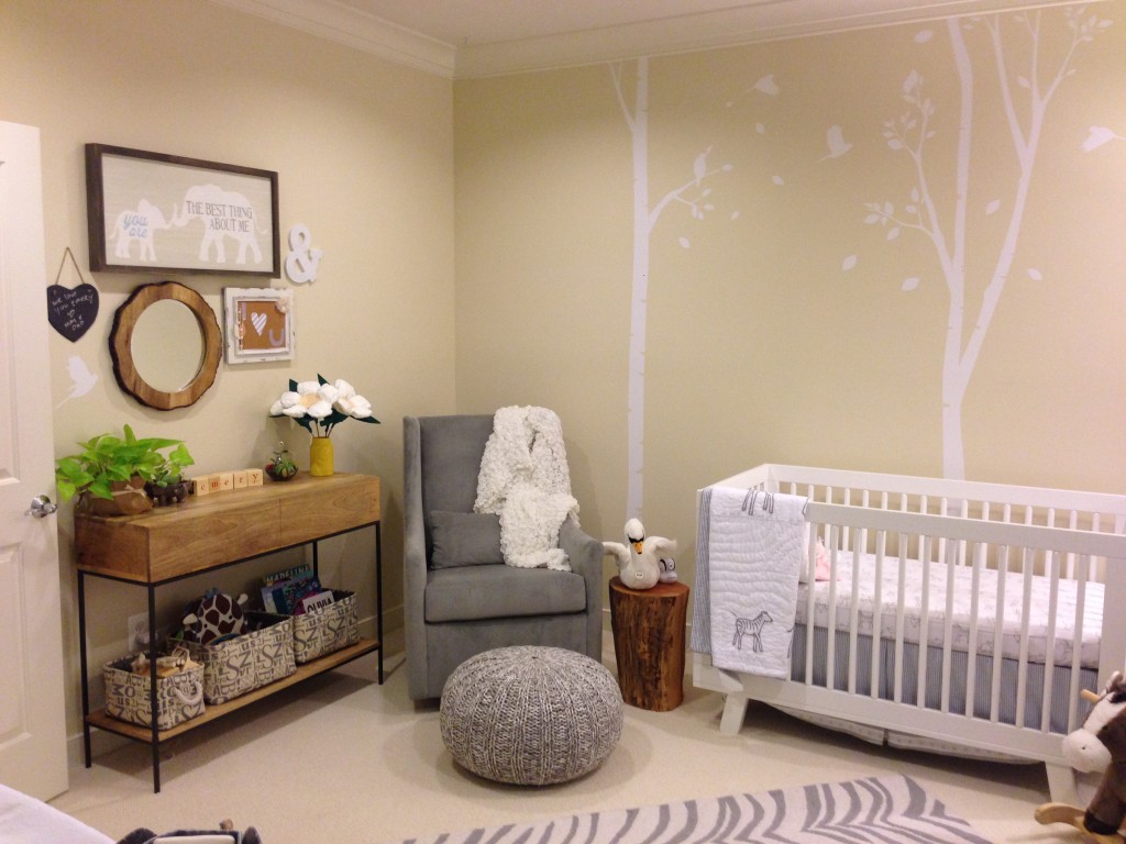 Baby nursery chic baby room decoration using white crib and cozy white bedding also gray glider rocking chair plus round stool also wooden shelf table designed with black iron legs complete wi