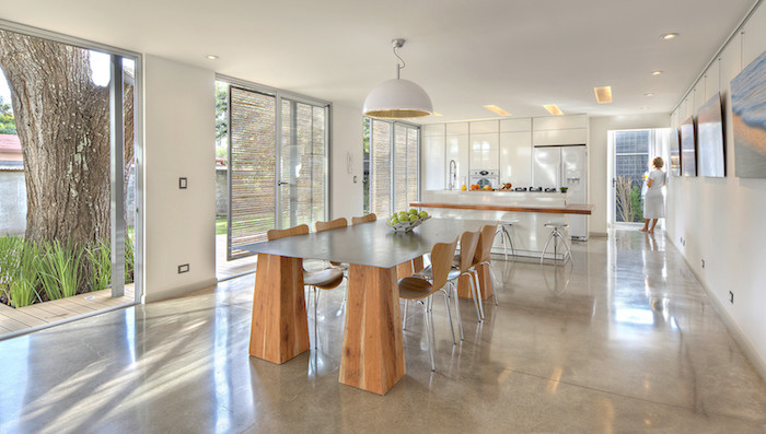 Hier finden sie ein modernes zimmer eines container hauses mit einem tisch mit tollen stühlen und weißen lampen und großen fenstern