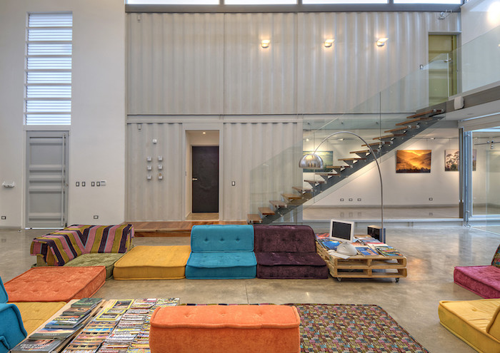 Hier finden sie ein zimmer eines container hauses das mit bunten sofas und tisch aus europalletten und treppen eingerichtet wurde
